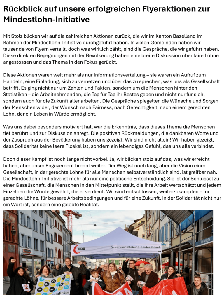 Kämpfe mit uns für einen gerechten Mindestlohn im Baselbiet! Werde aktiv in der Kampagne, unterstütze uns beim Flyern und setze dich für eine Veränderung ein, die allen zugutekommt. Deine Unterstützung ist der Schlüssel, um gegen soziale Ungleichheit anzutreten und echte Veränderungen zu erreichen. Zusammen machen wir den Mindestlohn zur Realität!